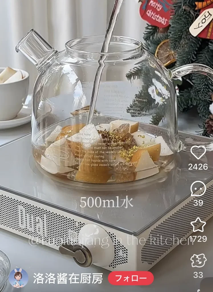 梨半切れ、5個の氷砂糖、一さじの桂花、500mL水、10分煮て茶こしで漉し温かいうちに飲む。
